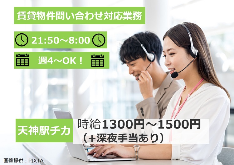 夜勤急募!時給1,300円|残業ほぼなし|週4~OK|11月入社!賃貸物件の入居者からのお問い合わせ対応@天神駅チカ