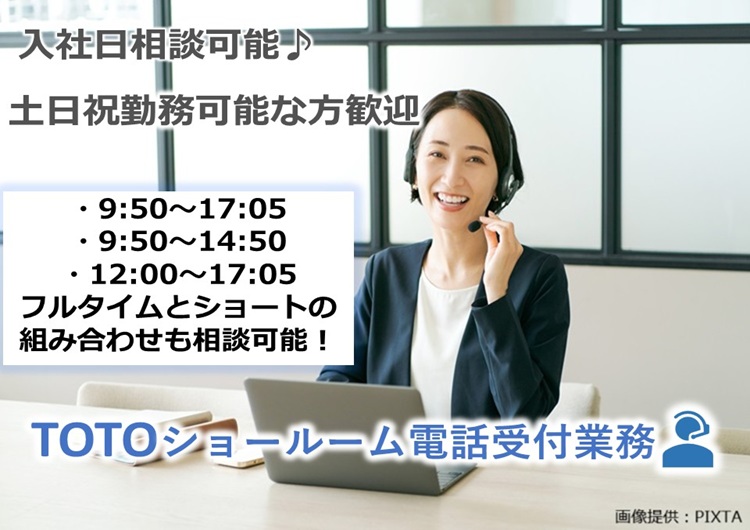 土日祝働ける方歓迎!TOTOショールームの電話受付・週3日~勤務OK【天神】