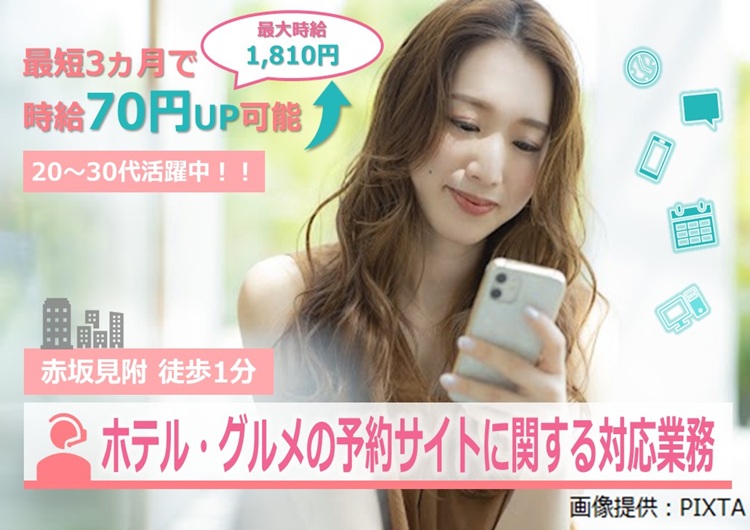 \旅行好き・グルメ好きなあなたにピッタリ♪/時給最大1,810円まで可能|旅館・ホテル・レストランの予約サイトに関するメール・電話対応業務@永田町/赤坂見附