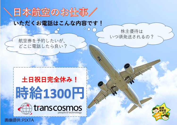 【完全週休2日で土日祝日お休み♪】憧れのあの企業のお仕事が出来ちゃう!?日本航空株式会社お問い合わせ対応【札幌駅】