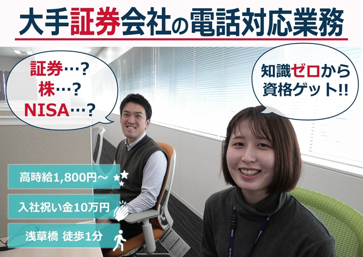 \一生モノの資格取得を応援/入社祝い金10万円♪高時給1800円×平日のみ×残業ナシ!大手証券会社の電話対応業務@浅草橋
