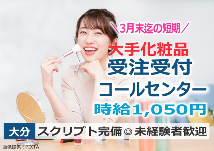 【3月末までの期間限定】土日祝休み!化粧品の注文受付/週3日~/髪型・ネイル自由 大分