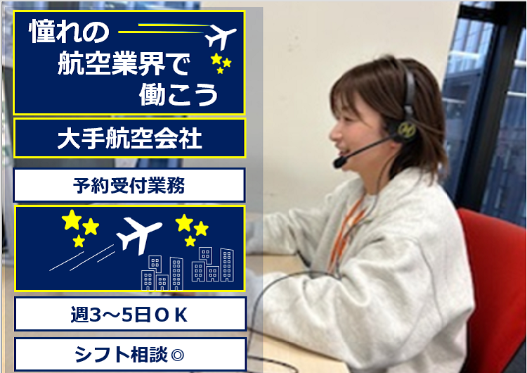 憧れの航空業務|大手航空会社予約受付コールセンター|週3~5日|ショート勤務あり|天神駅チカ