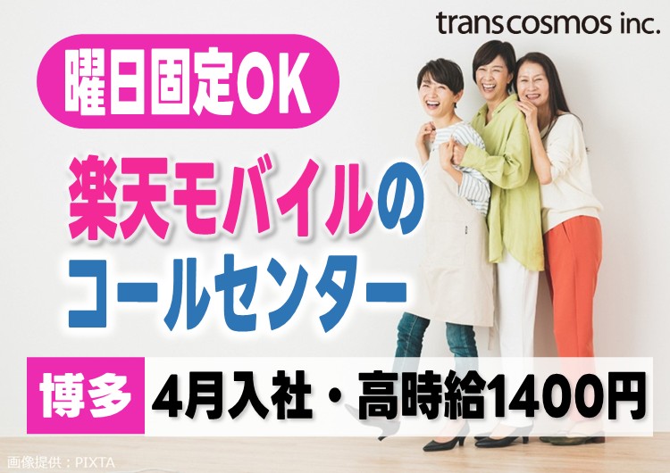 締切せまる!!【4/6入社】高時給1400円・楽天モバイルのお問合せ対応【博多駅】