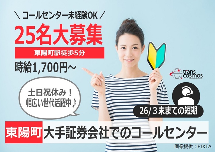 26年5月末までの期間限定!\未経験OK!高時給1,700円!平日のみ!/大手証券会社の問合せ対応@東陽町
